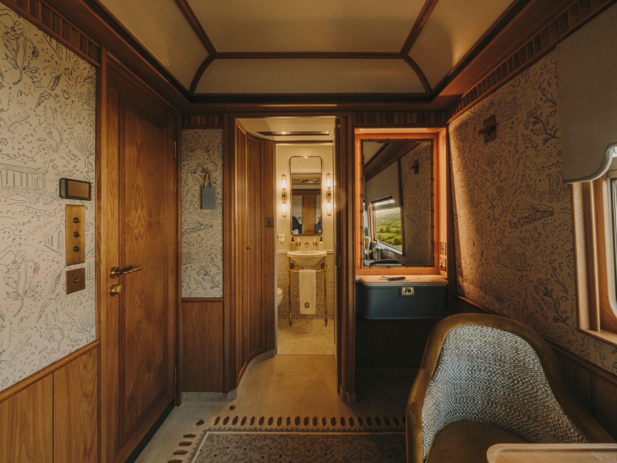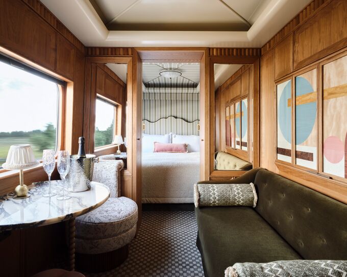 Each of the 18 cabins - comprising three Grand Suites and 15 Suites - features custom elements including hand-selected antiques, bold fabrics, and original artworks. Luke Edward Hall has reinterpreted Rubelli fabric with whimsical designs inspired by landmarks guests will encounter during their travels, whilst Marcus James has created intricate pen depictions of Lake District landscapes.