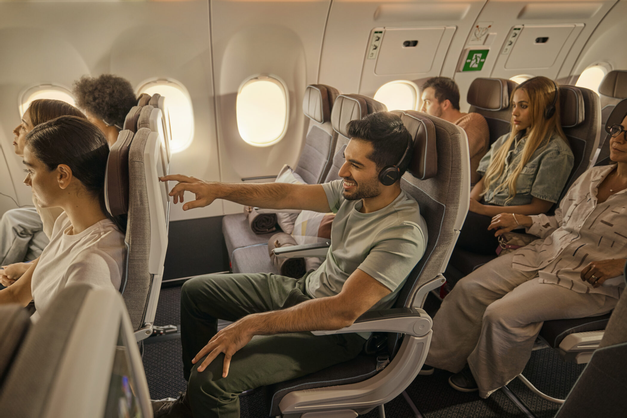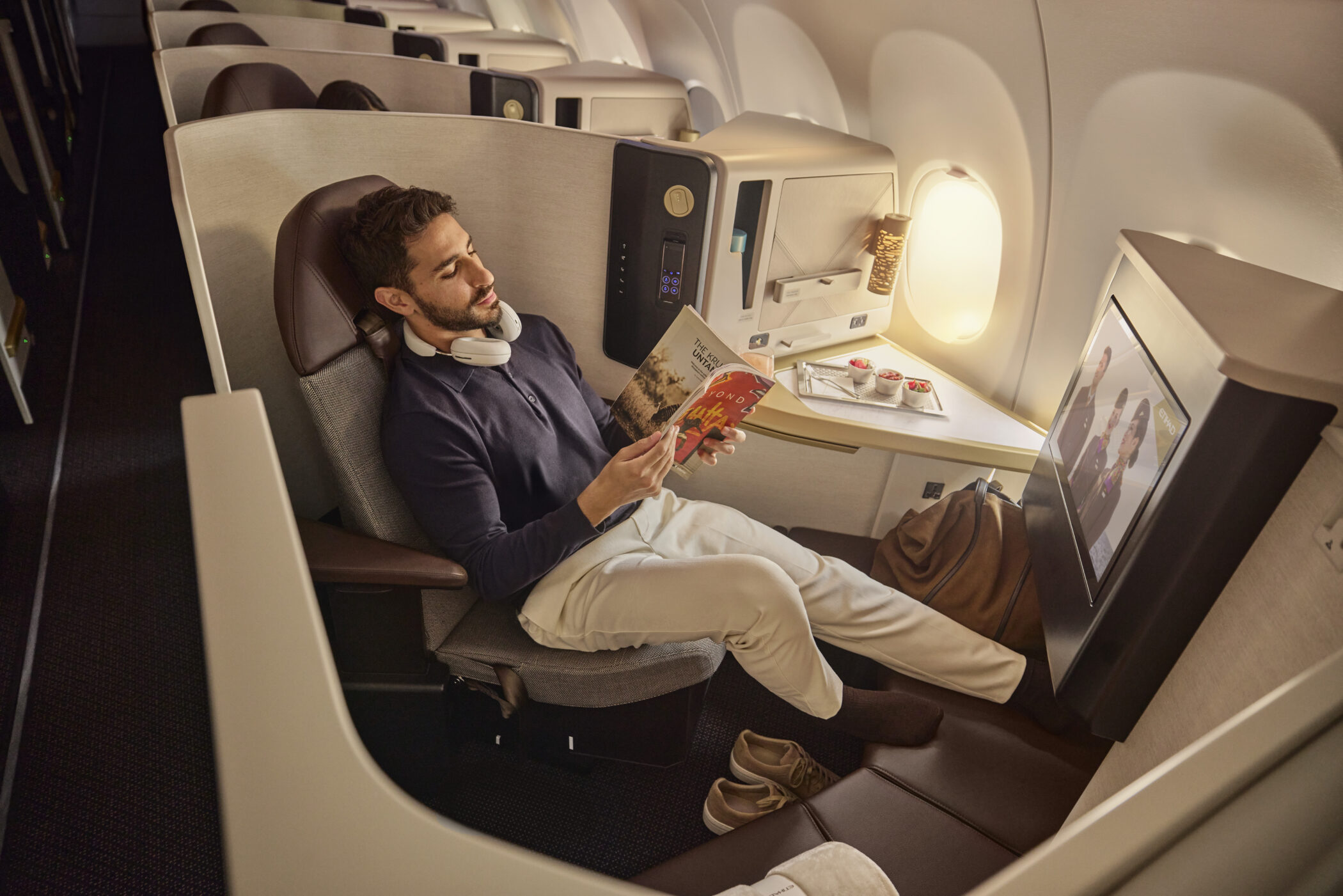 Business class flyers receive forward-facing lie-flat seating (see featured image at the top of the story) with direct aisle access, supported by 17.3-inch 4K screens, noise-cancelling headphones, wireless charging and high-speed wifi. Even in economy, passengers benefit from 13.3-inch 4K touchscreens, Bluetooth connectivity and complimentary dining, with a second service available on longer flights.