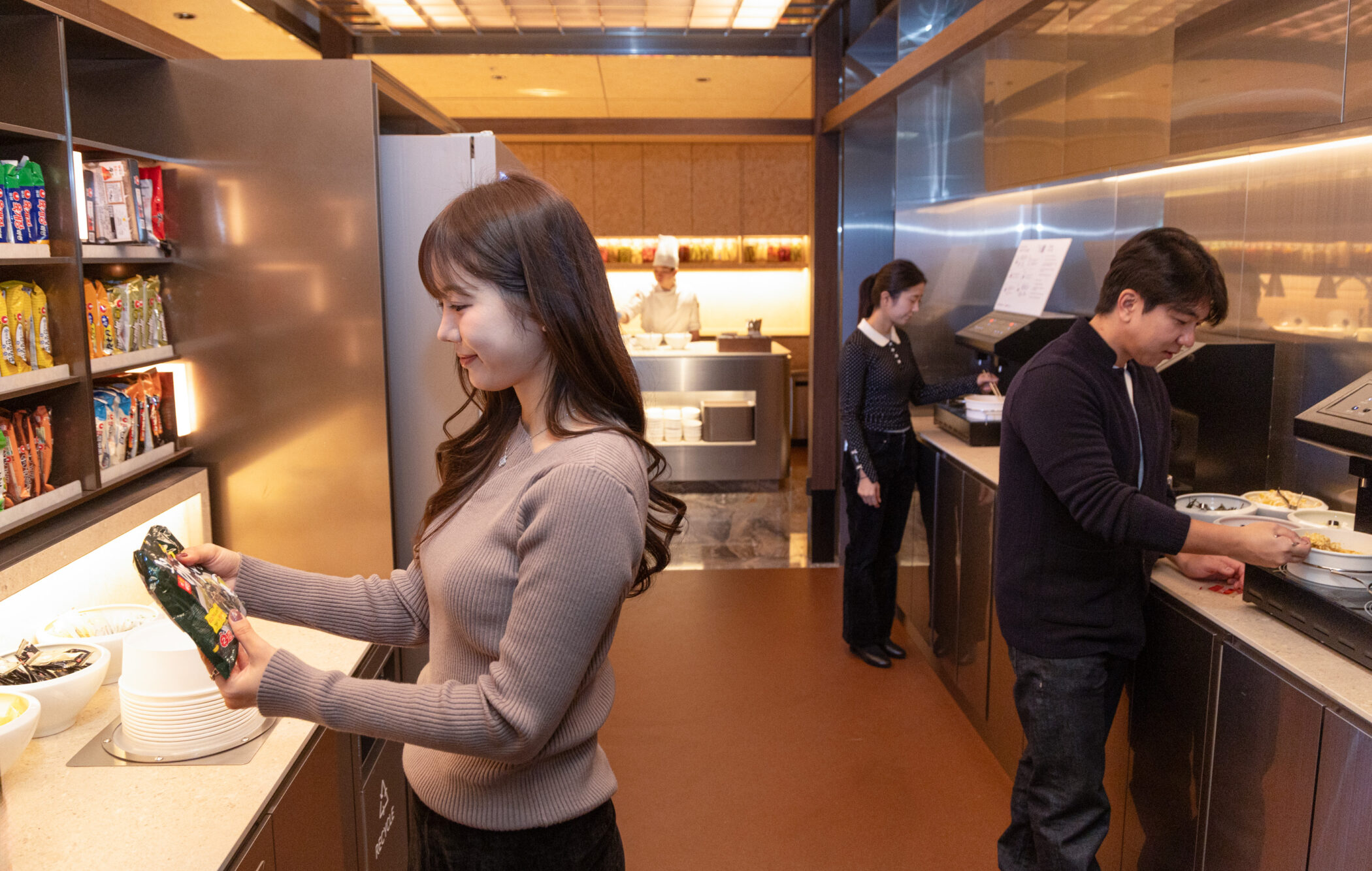 Alongside the ramyeon library, the lounge introduces several new experiential spaces. One of these is Cooking Studio L’atelier, operated with chefs from the Grand Hyatt Incheon.