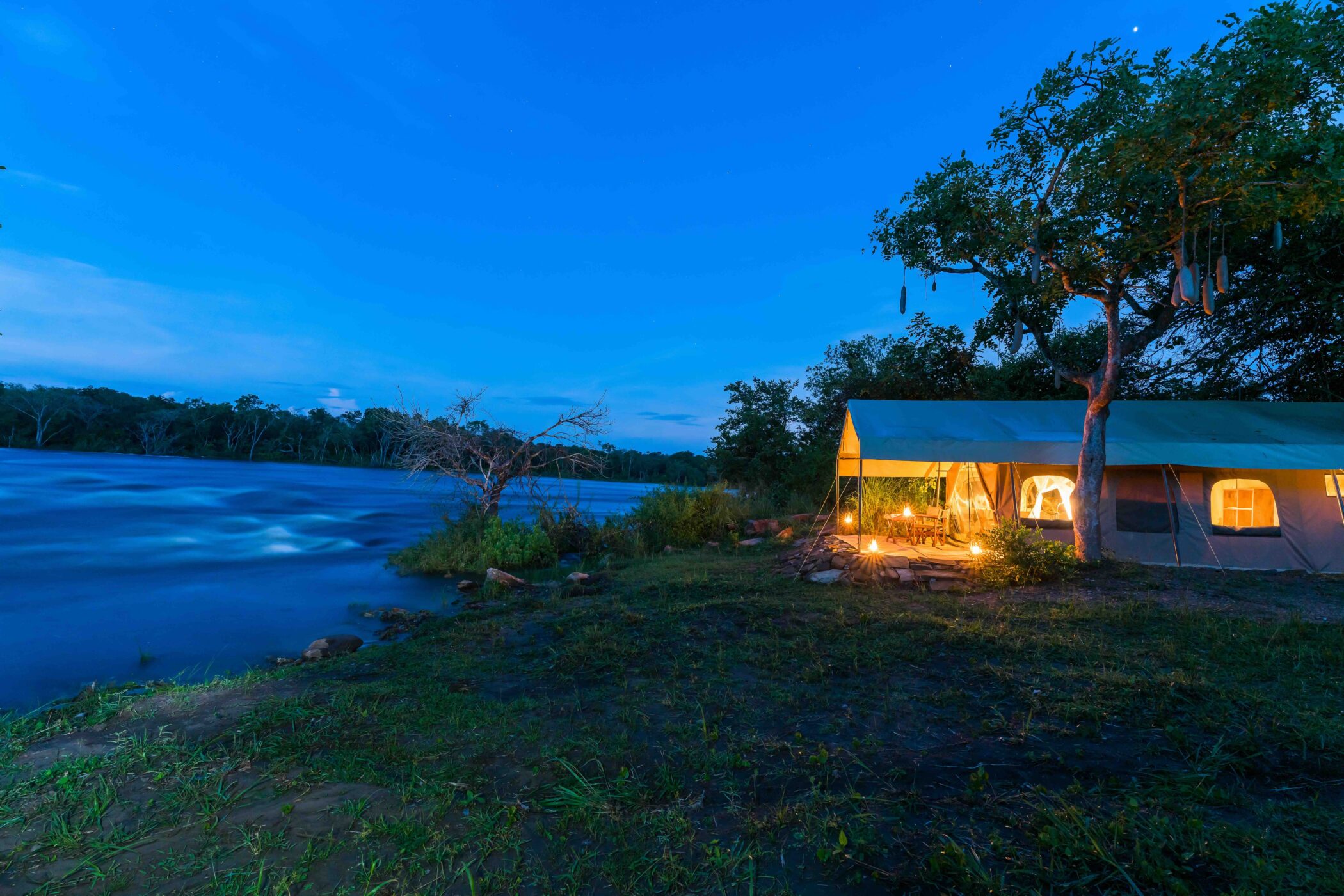 Papa’s Camp perches on the south bank of the Nile beneath fig trees, five tented suites arranged along a stretch of river where hippos grunt through the night and dusk folds a metallic warmth over the water. The interiors carry the quiet signature of Pam: sisal carpets, Persian runners, English crockery, deep armchairs and a kind of lived-in eclecticism – thoughtful without the performance of “design”. Mornings begin with warm fairy cakes – carrot-and-ginger, chocolate-chip – delivered by staff who sing you awake at dawn; evenings end with deckchairs pulled around a fire on the bank, the Nile sliding past under the dark.Papa's Safari TentsChef preparing a bush breakfast, Uganda, WildPlaces