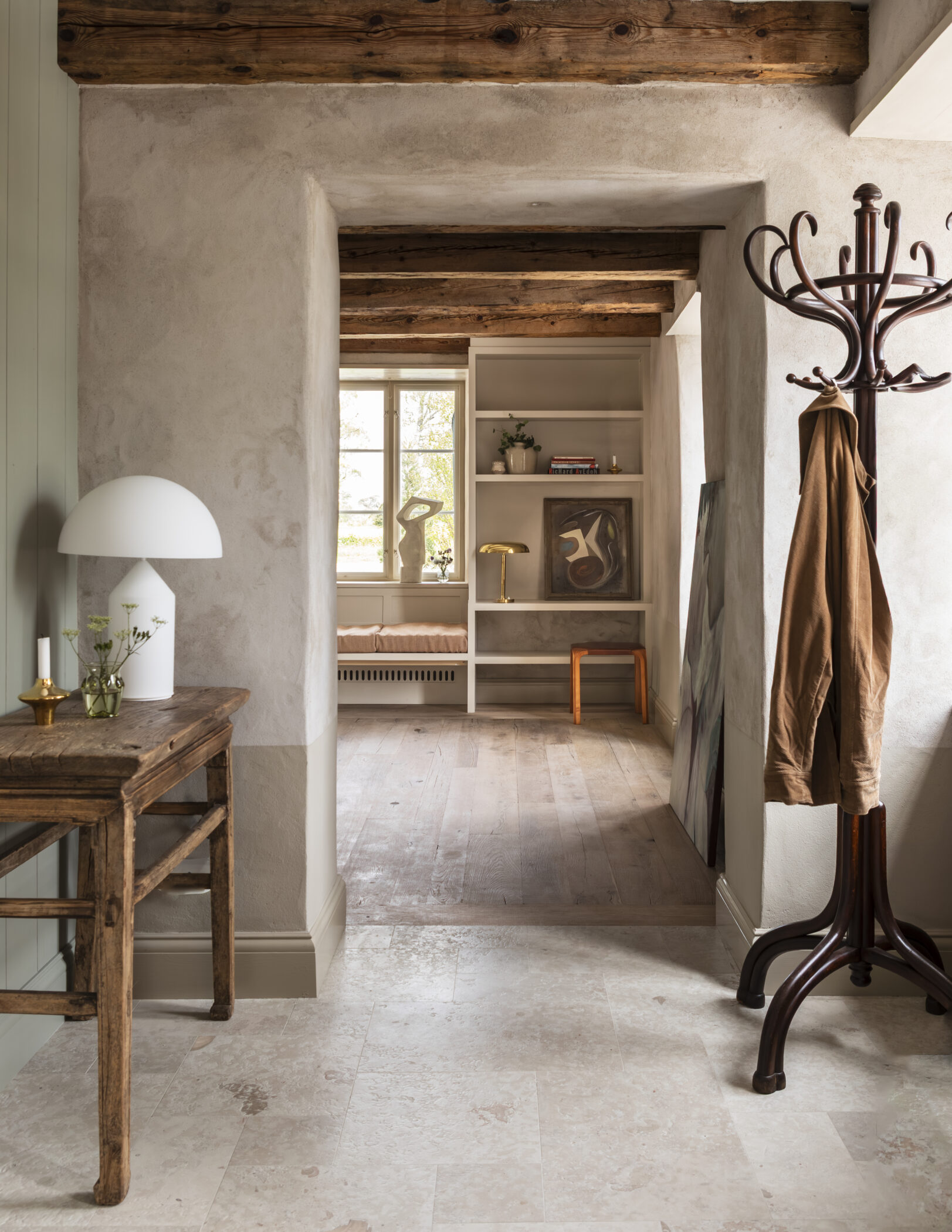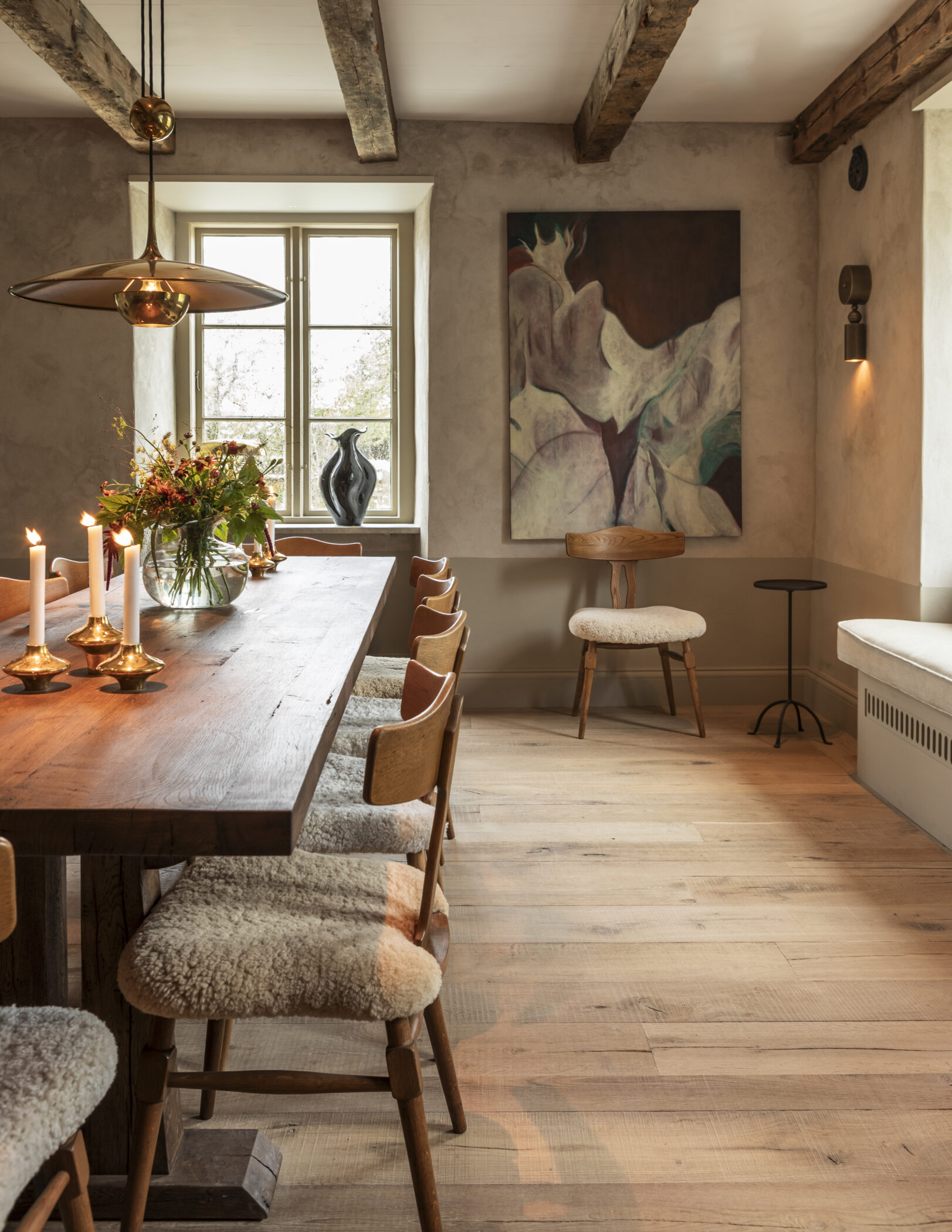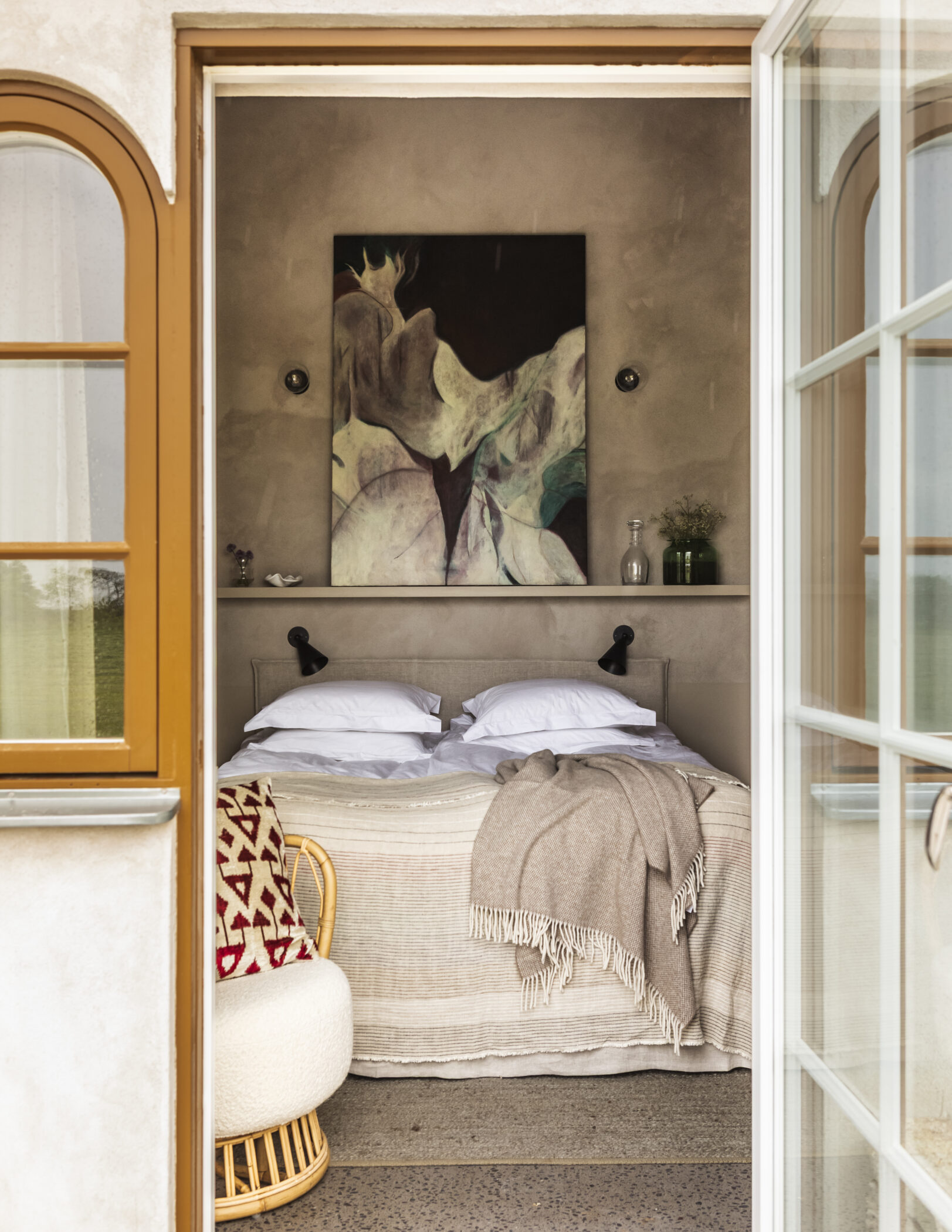 Rooms are spread across the Farmhouse Hotel and The Bunkhouse, each named after important women in the founders' families and friend groups. Interiors feature sheepskin throws, limewashed walls, soft palettes and contemporary art.
