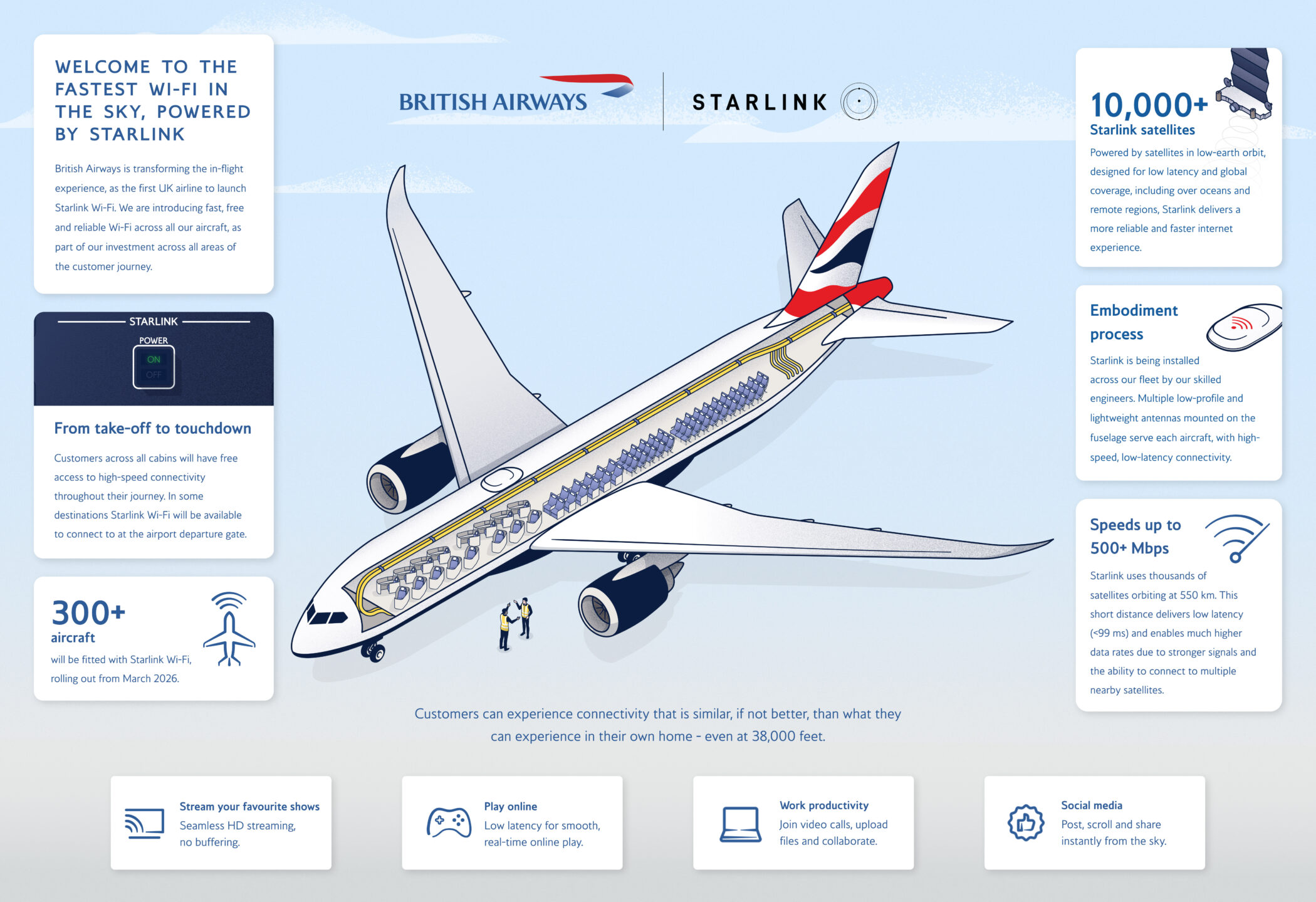 The new system allows passengers in all cabins to access free internet from take-off to landing. Using a network of more than 10,000 low-Earth orbit satellites, Starlink provides faster and more stable connectivity than traditional inflight systems. British Airways says customers will be able to stream content, work online and browse across multiple devices, with download speeds reaching more than 500 Mbps.